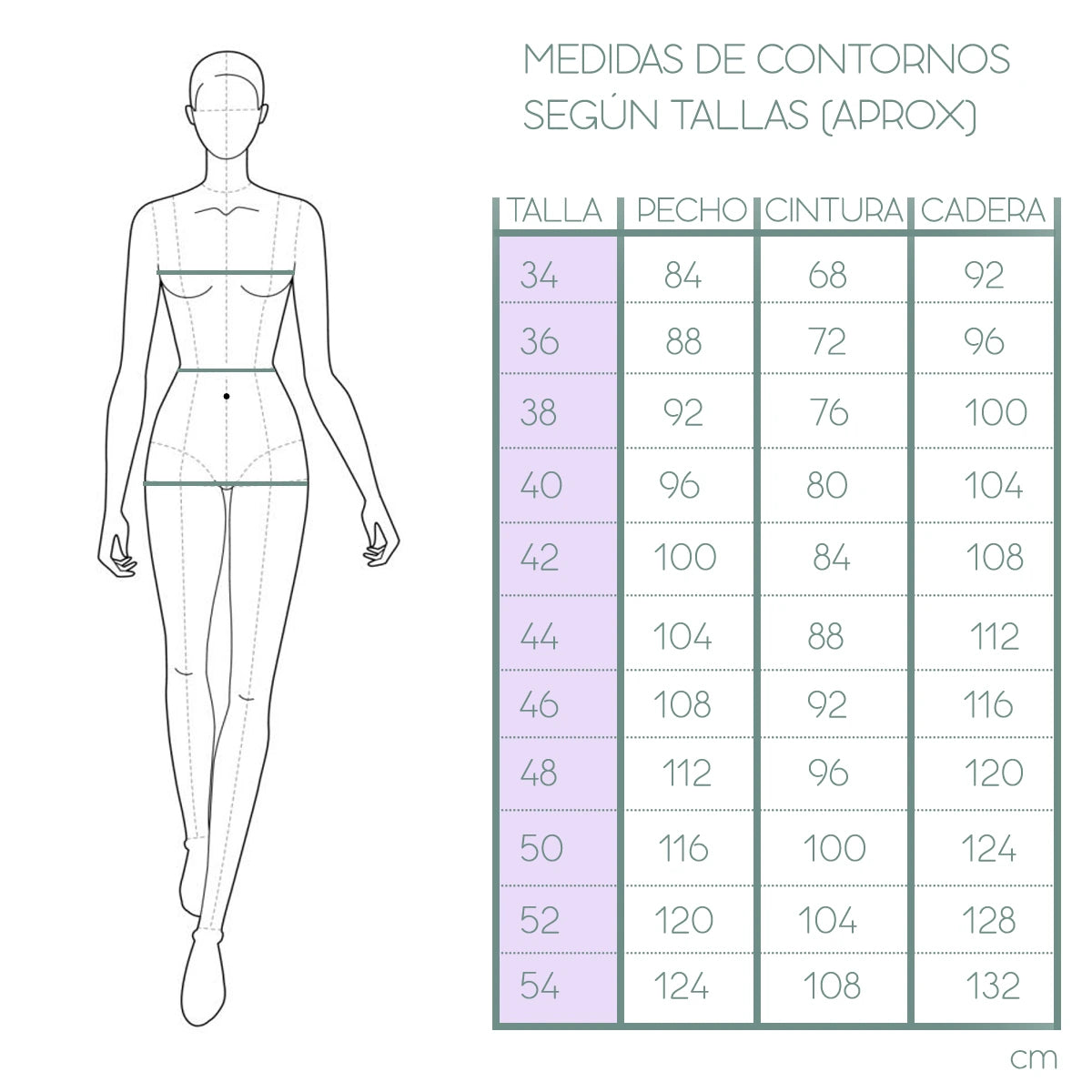 Y te damos un truquito sencillo para orientarte, multiplica por dos el numero de la talla y tendras la medida de contorno de cintura alta, por ejemplo…. una talla 40, tiene 80 cm de contorno de cintura alta… 40×2=80 cm. y si a esto le sumas 16 cm.. tienes la medida de cotorno de pecho y sumandole 24 cm... la de cadera ;).